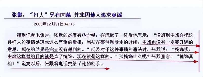 2003年,张默在中央戏剧学院把女友童谣打了,刚开始两人只是在宿舍门口争执,他看到童谣要跑,就把她拽到校门口,一顿拳打脚踢。