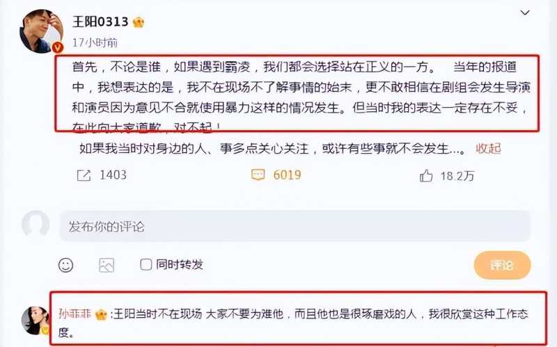 如今,眼见事情闹大,王阳主动道歉了,他一改口径,称自己会坚决站在正义一方。
