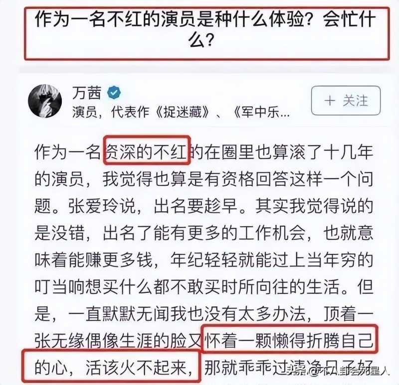 表面不慕名利,暗地里努力的还有万茜。2016年,万茜在某平台回答“作为一名不红的演员是种什么体验”时,自称“懒得折腾”。