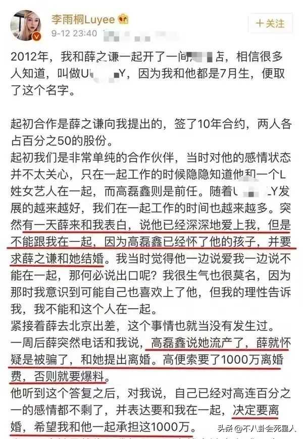 结果离婚2年后,薛之谦又高调官宣和高磊鑫复合,但网红李雨桐发长文控诉被薛之谦欺骗感情和钱财,一时间,薛之谦的好男人人设也崩塌了。