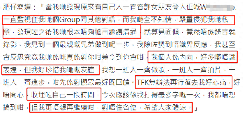 偏偏在这个时候,TFK突然曝出了不和传闻,一位名为肥仔的成员更是发文表示自己要退出娱乐圈,还暗示组合出现了内鬼,有人容许自己女朋友登录社交软件查看他们内部的聊天内容,他觉得自己隐私受到了侵犯,对成员失去了信任,无法再继续下去了。