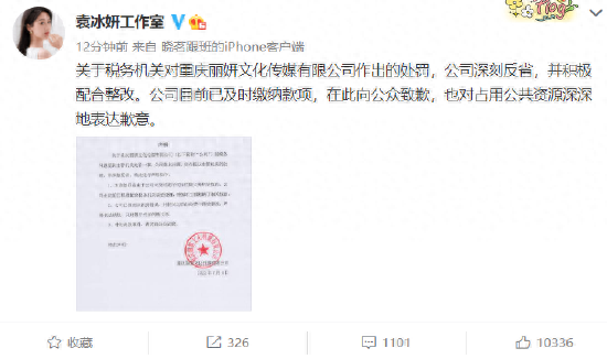去年7月,袁冰妍工作室曾因偷漏税登上热搜。2022年7月4日,袁冰妍工作室发文就偷税漏税事件道歉,称本次处罚是由于公司未及时履行代扣代缴义务,已积极配合税务机关调查处理,并按时全额缴纳了相关税款,已经深刻认识到错误,向公众致歉,以后会严格依法纳税。