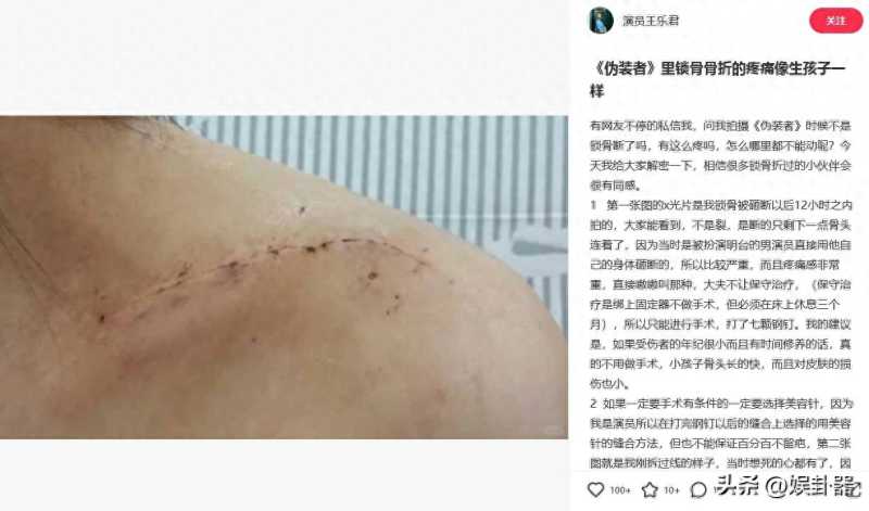 王乐君在社交媒体上晒出了多张受伤照片,展示了她的锁骨伤势。她透露这一伤势是在拍摄《伪装者》时发生的,由于男主演员胡歌在戏中的动作,导致她的锁骨断裂。这一伤势严重到需要进行手术,并植入七颗钢钉来修复。这一事件揭示了明星在拍摄过程中也面临着身体健康风险,即使在表面上看似轻微的动作也可能导致严重的伤病。