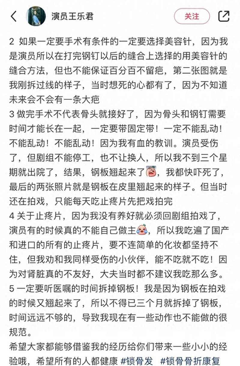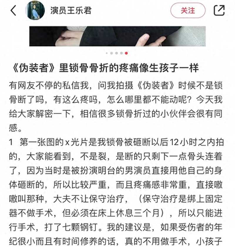 从王乐君自己的文章内容来看,很多人给他私信问他拍戏的时候锁骨是不是骨折了《伪装者》,疼得那么厉害,为什么哪里都动不了?