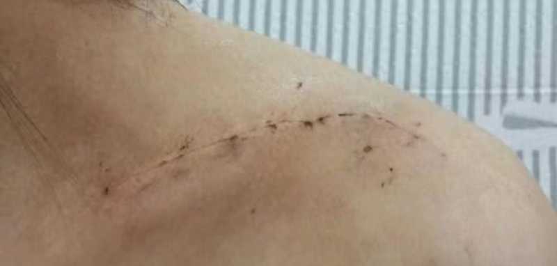 虽然手术时使用了美容针,但锁骨和肩膀上留下了很长的疤痕。他说:“我什至想死。”