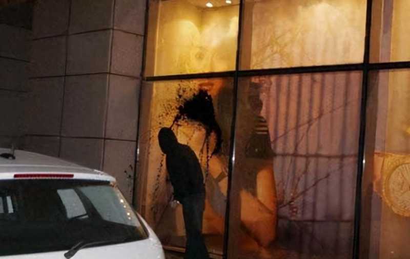 ”也许他叫喊得还不过瘾,接着拿出一桶油漆,冲向章子怡代言的珠宝店海报,狠狠地泼了上去。这一幕被狗仔们全部抓拍下来,成为当时震惊一时的“泼墨门”事件。