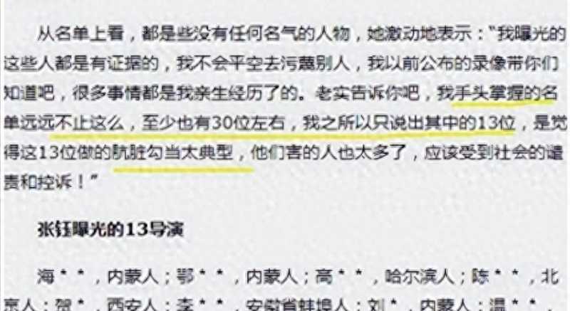 张钰:揭露娱乐圈丑闻的牺牲者张钰这个名字或许并不为大众熟知,但她却用自己的前途揭示了娱乐圈的丑陋。在2003年的一场发布会上,她爆料涉及十几位导演的性丑闻,源于导演黄健中未兑现对她和朋友的承诺。尽管张钰曝光了证据,但最终她的事业以牺牲为代价草草结束。