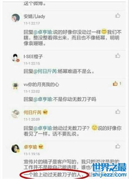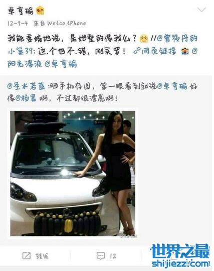 再翻到卓亨瑜12年转发过的一条微博,有人说她和杨幂特别像,卓亨瑜则回复到“我能委婉的说,是她整的像我么?”由此可见她的心态究竟是如何,根本就是从一开始就打算蹭热度,这是用生命在模仿和炒作啊。