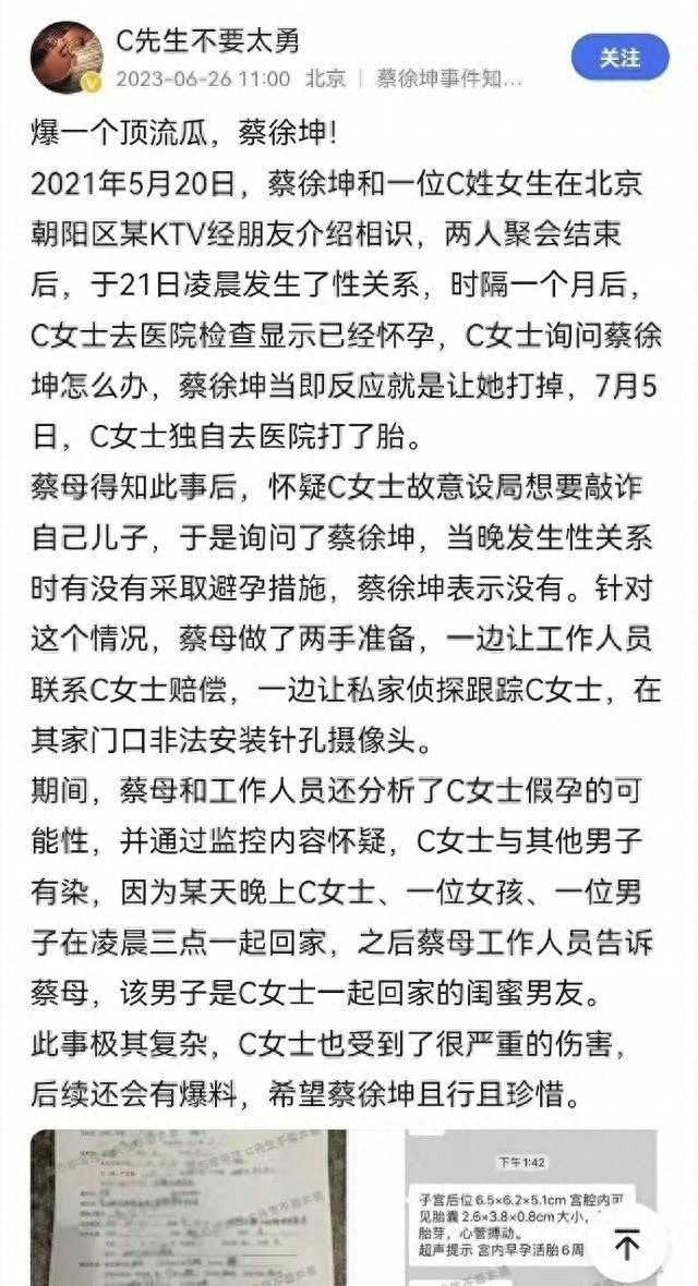 2023年6月,蔡徐坤作为顶级明星,成为Prada代言人。 然而,这场看似光鲜亮丽的合作背后却爆发了意想不到的丑闻。 有传言称蔡徐坤曾发生一夜情,导致该女子怀孕。 其母亲甚至高价要求该女子堕胎,疑似该女子聘请私家侦探监视她。 这一系列事件引起人们对蔡徐坤的极大质疑和讨论。