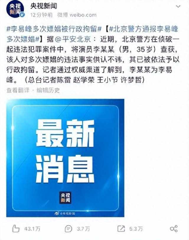 9月11日,官媒报道称,北京警方在侦查一起违法案件时,引出了李易峰。 李易峰对自己多次嫖娼的违法事实供认不讳。 警方已对其实施行政拘留。