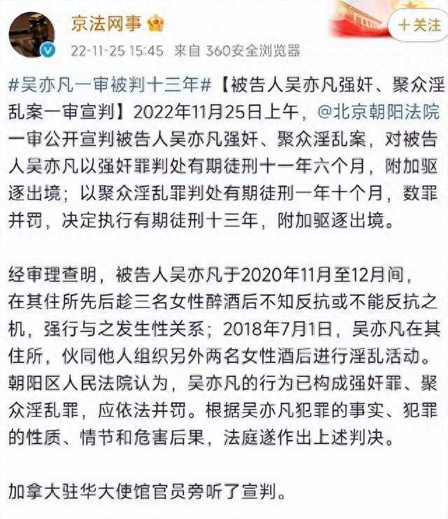 11月25日,吴亦凡强奸案宣判结果公布:吴亦凡因强奸罪、聚众淫乱罪被判处有期徒刑13年,并因逃税罪并处罚金6亿元。