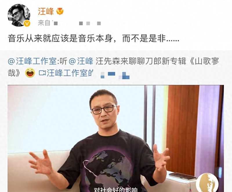 汪峰则发视频回应,称自己从来没对刀郎有过任何偏见,反而很尊重对方,他还以专业角度夸赞了刀郎这张新专辑。而且他觉得“音乐从来就应该是音乐本身,而不是是非”。