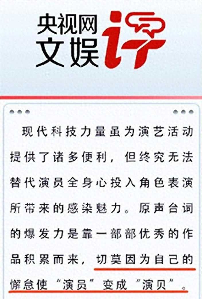 虽然科技进步给演艺活动带来了便利,但是演戏仍然需要演员将别人的人生展现出来,并且要求演员真情实感。一些演员却只顾借用配音演员,甚至连台词都不背,这严重影响了作品的质量。当粉丝对自己偶像的台词不满意时,有人提出为什么不能使用配音。