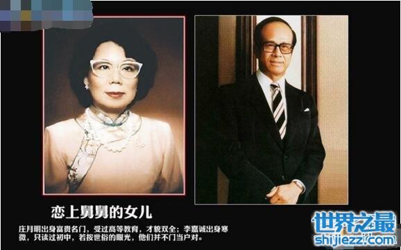 话说李嘉诚老婆庄明月可是李嘉诚的表妹,两人近亲关系,所以刚开始一直都被双方家长反对。还有一点就是,当年李嘉诚可以说是一个事业刚起步的人,谈不上多么有钱,而李嘉诚老婆庄明月可是一个富二代,她的父亲是庄静庵,是香港第一代钟表商,创办了中南钟表有限公司。而李嘉诚出身寒微,只读过初中,虽然说事业初成,但是将来的发展谁都说不清,所以其实李嘉诚还配不上庄明月的。