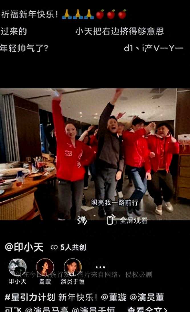 2022年12月31日的跨年夜,印小天选择了跳舞的方式来迎接新年的到来,与一群同事一同载歌载舞。视频发布后,一些敏锐的网友惊讶地发现,其中居然有女星董璇,她就站在印小天的旁边。这一出乎意料的合作令众人大感振奋。
