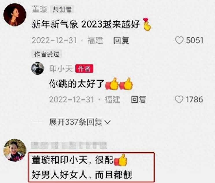 不久之后,董璇在视频评论区留下了一句富有新年祝愿的留言:“新年新气象,2023越来越好。” 印小天不仅点赞了这条评论,还回复道:“你跳得太好了。” 这个突如其来的互动令众人措手不及。
