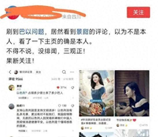 您对景甜的言论以及巴以冲突的看法如何?您认为对于这样的敏感议题,我们应该如何处理和解决?请留下您宝贵的评论和观点。
