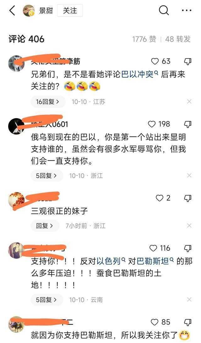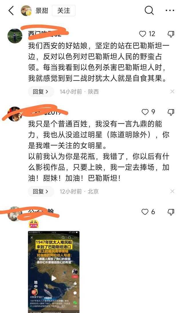 许多网友在评论区纷纷反驳她的观点,认为她对以色列的批评过于偏颇,忽略了巴勒斯坦方面的问题。他们认为这种偏见会进一步加剧双方的对立,无助于找到和平解决方案。尽管如此,也有一部分网友支持景甜的勇气和勇敢发声。