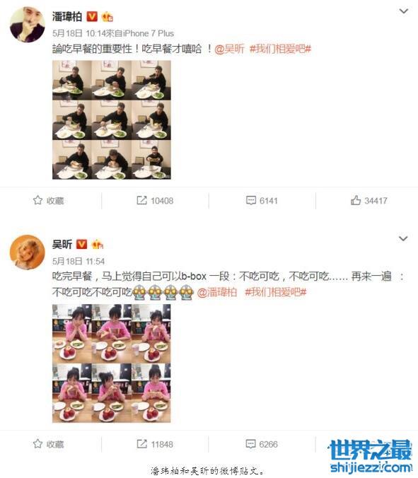 潘玮柏微博上传九宫格连拍照,大口吃三明治,而吴昕的则是六宫格的自拍照,桌上很多水果,一口一口慢慢吃。潘玮柏说轮吃早餐的重要性,吃早餐才嘻哈,而吴昕似乎也是回应,吃完早餐,马上觉得自己可以B-BOX一段:不吃可吃,不吃可吃……再来一遍:不吃可吃不吃可吃。没有默契,没有商量,没有任何理由两个人会如此同步,唯一理由就是,潘玮柏女友就是吴昕。