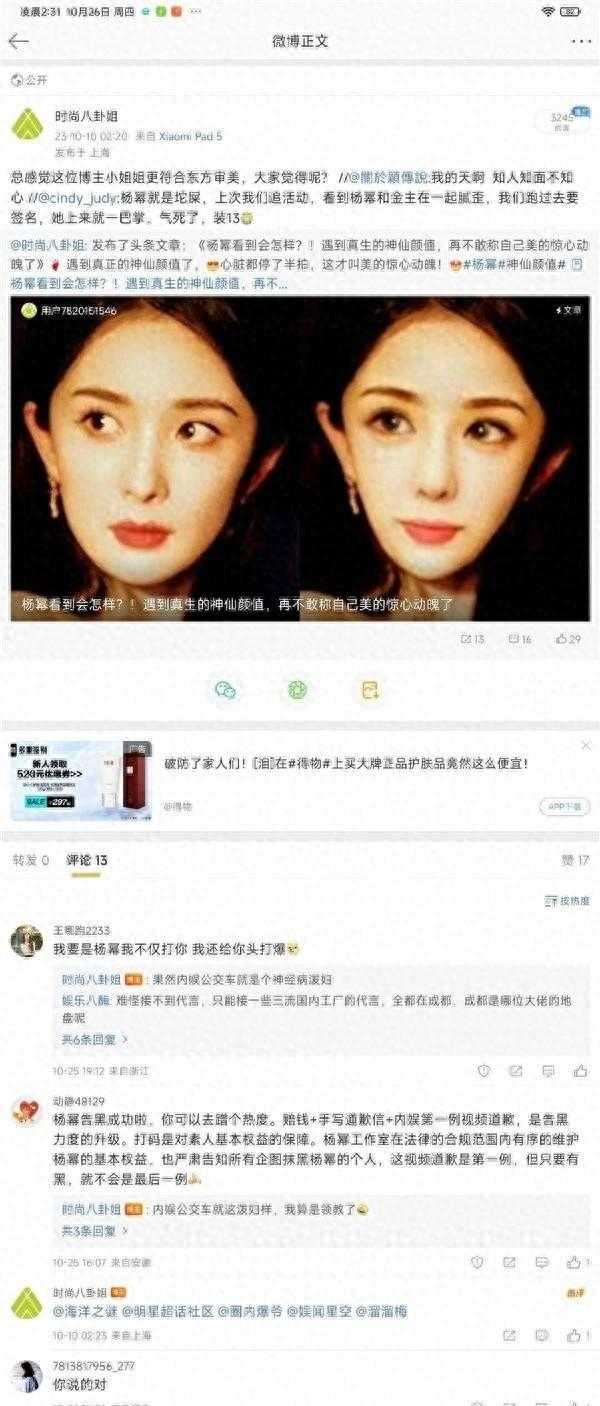 这样的行为实在令人震惊,让人不禁质疑一个备受瞩目的演员是否应该有这样的言行举止。接下来,我们看到博主对杨幂的负面行为有所质疑,他提到了一些之前关于杨幂不尊重粉丝、欺负新人的爆料,以及一些不光彩的新闻报道。虽然之前博主并不完全相信这些负面信息,但现在博主认为这些爆料是真实的。