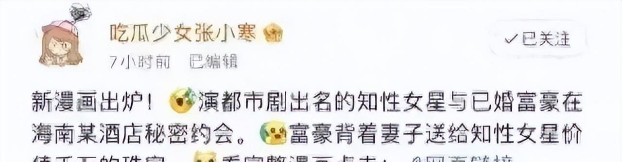 江疏影最近陷入了一场轰动性的丑闻中,她被一位名为张小寒的网友揭露与已婚富豪约会的事件。这位神秘金主不仅扒光了江疏影的“底裤”,还通过漫画形式将其行为公之于众。据张小寒所述,江疏影接受了这位富豪送给她价值上千万的珠宝,引发了广大网友们对此事的关注和深度挖掘。