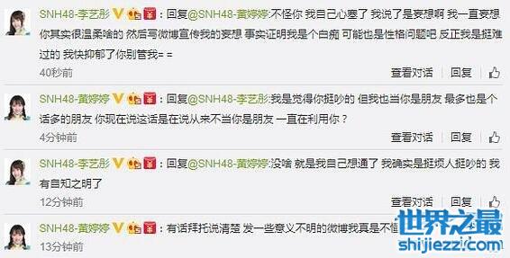 直到后来有人爆出了卡黄微博好友圈中的对话,两人似乎吵架了。从对话中可以看出,黄婷婷对于李艺彤发的一些意义不明的话表示不理解等等之类的,总之,在这件事情发生后,卡黄之间的交集和互动也越来越少。现在李艺彤微博上,所有关于黄婷婷的内容,也都一条一条的慢慢被删除了……