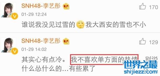 后来不知道是什么原因,似乎李艺彤对于CP的态度产生了180度大转变,在当时微博还有INS上说了很多模棱两可的话。比如“不喜欢单方面的热情”“心有点冷”之类的,而那时候黄婷婷并没有意识到,还是和平时一样相处。