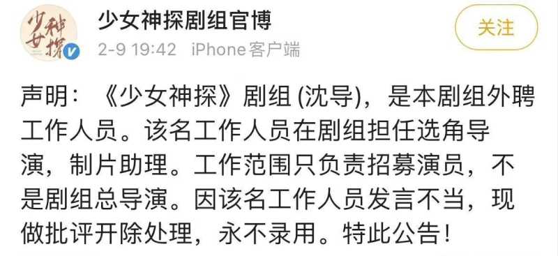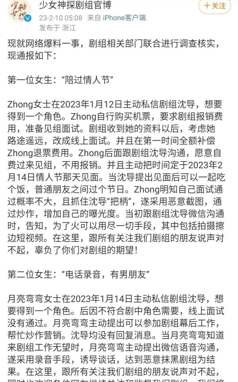 剧组之后又发了一篇长文,并且将这件事的责任都推到了3个女演员身上。