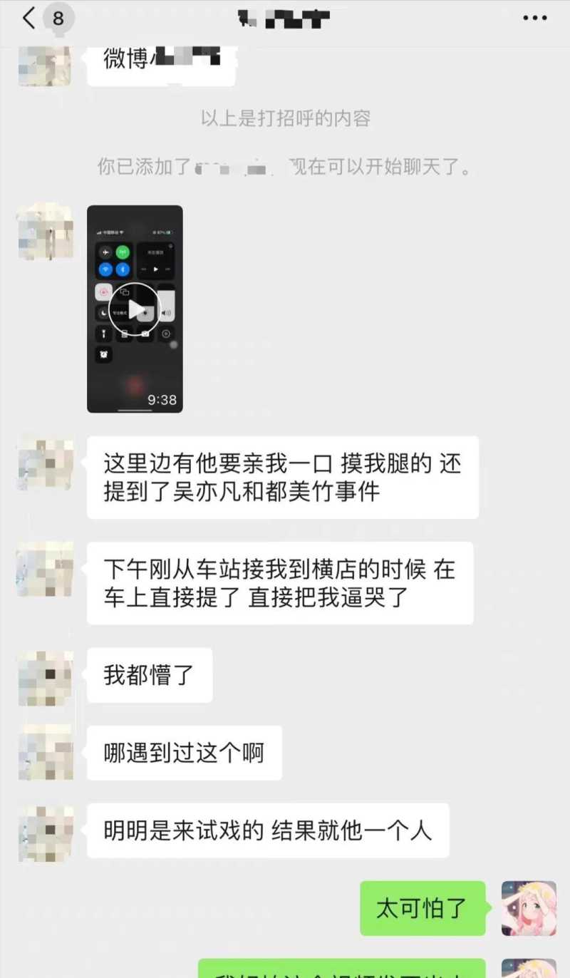 除此之外,另一个女演员也晒出了聊天记录和录音,内容更是令人意想不到。导演以试戏的名义叫女演员过来,但最终到场之后只有导演一个人录音也记录下了她被威胁的全过程。这位沈导表示,如果今天女孩愿意留下来,他可以直接将20万的片酬当场付清。女孩不敢相信,又反问了一遍。导演表示如果角色少,可以将价钱加到30万。女孩当场就拒绝了,问道这不就和当时“都美竹事件”一样吗?