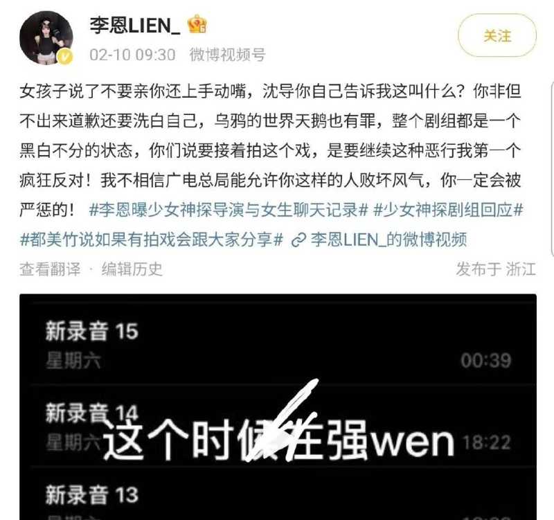 李恩在社交平台发文爆料,并且还晒出了实锤,聊天记录和录音都有。此次爆料引起了众多网友的关注,在事件持续发酵后,《少女神探》的剧组也做出了正式回应。