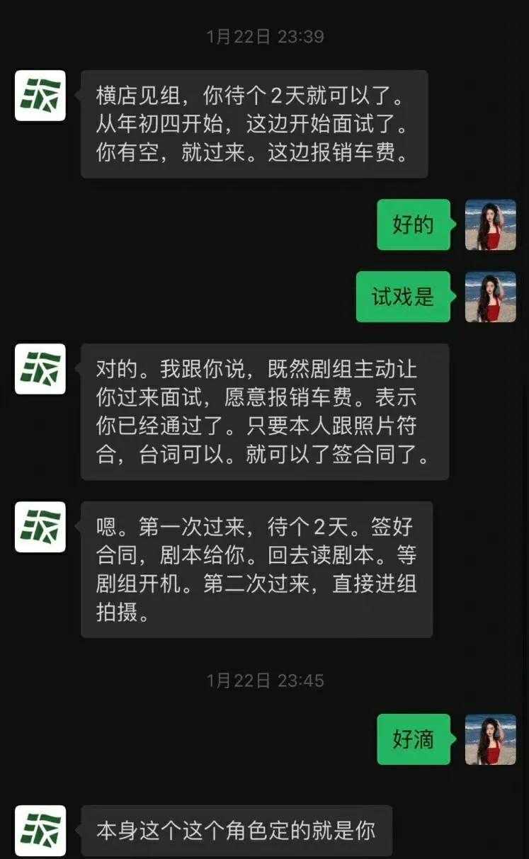 从晒出的聊天记录可以看得出来,导演当时用角色来诱导另一位女演员,要求对方陪他睡觉,只要答应了就能进组。