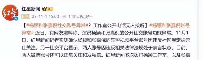 女演员杨颖和张嘉倪的社交账号近日被爆出异常,引发了网友的广泛关注。据查询,其一个社交平台显示,两人的账号因违反相关法律法规处于禁言状态,而在另一个平台,