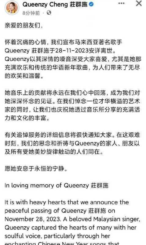 马来西亚失去了一位杰出的女歌手,庄群施(Queenzy),