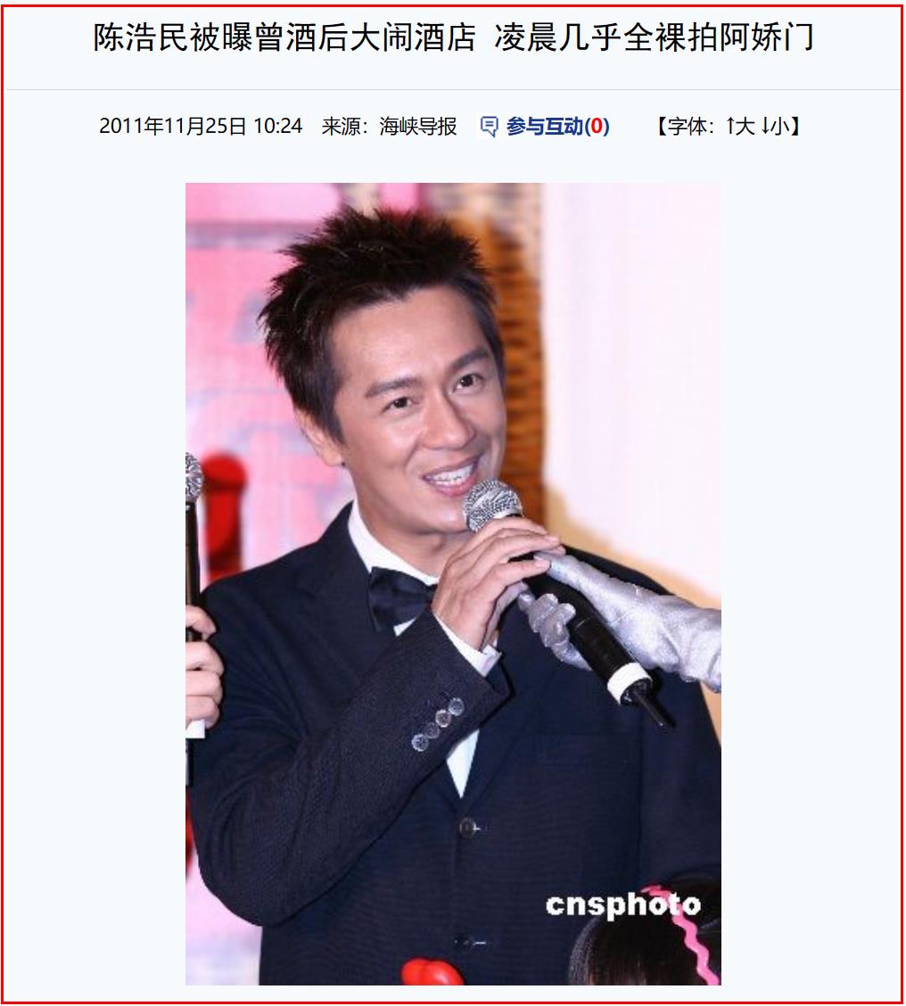 2011年,在横店拍摄《笑功震武林》时,陈浩民和剧组聚餐,酒过三巡,竟然将咸猪手伸向了,同剧组的19岁新人陈嘉桓。