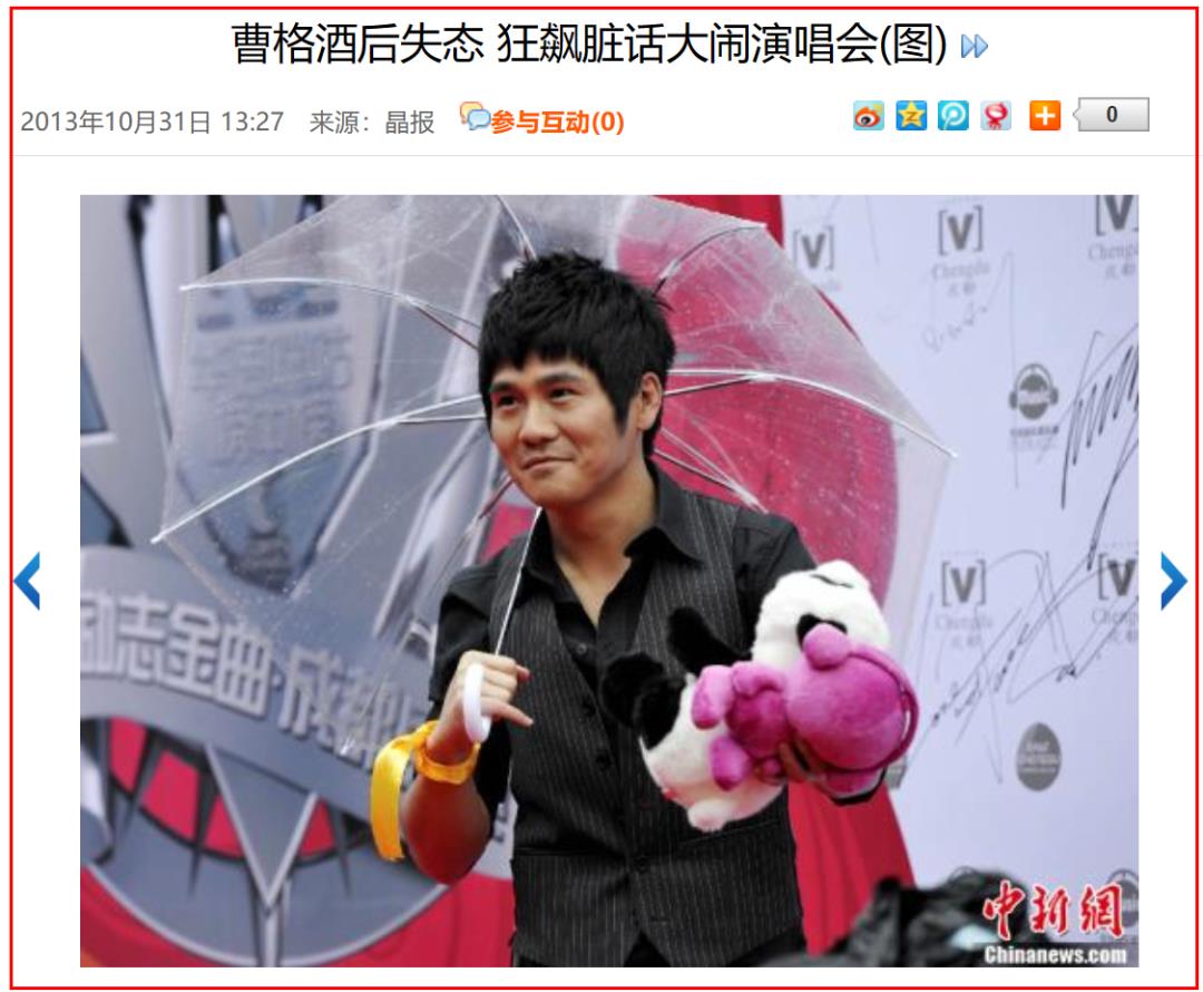 2006年,曹格喝醉后猛踢餐厅立牌,受伤缝了20多针;2007年、2009年,醉酒的他又挥起醉拳,连好友侧田都挨了揍;2013年,曹格又大闹林志颖的婚礼,演唱会,酒后狂飙脏话……