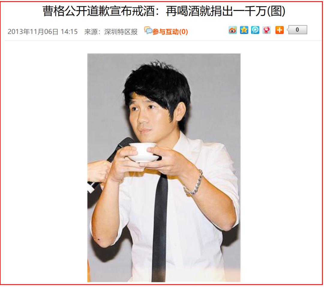 眼看事业和家庭双双亮起红灯,2013年,曹格痛定思痛,召开记者会公开道歉并宣布戒酒,表示再喝就捐款1000万。