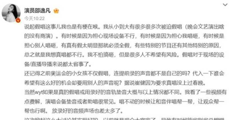 然而,对于假唱这件事,大陆女演员邵逸凡给出了自己的看法。她坦率地分享了自己的经历,告诉我们在演艺圈里,假唱并不是不可告人的秘密。邵逸凡直言:“有时候,是设备问题,有时候,是担心现场发挥不佳。”她的话语,就像是在为艺人们辩护,暗示着假唱背后可能有着我们不知道的苦衷。