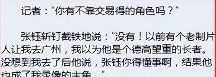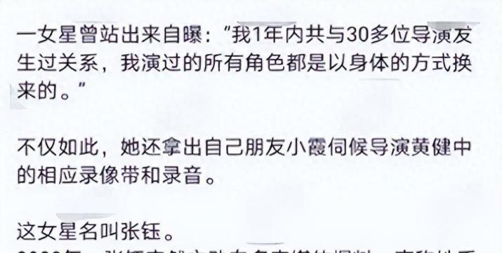 最近,一位名叫张钰的女星爆料了自己在娱乐圈中遭遇过的潜规则,并拿出了录像带、录音带等证据来证明自己所说的一切都是真实的。张钰称,她从2008年开始进入娱乐圈,至今已经和30多位导演、影视公司老板发生过关系,其中包括黄健中、张纪中、于敏等知名导演。她说,她之所以做这些事情,是因为她想要出名,想要得到更多的角色和资源。她说,她并不是唯一一个这样做的人,在娱乐圈中,有很多女星都是通过潜规则来上位或者保住位置的。