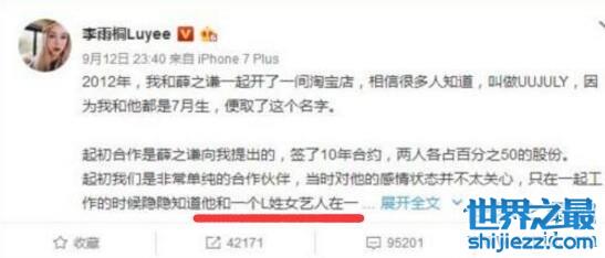 之前李雨桐第一次发微博细数和薛之谦的故事,李雨桐在文中称2012年,她与薛之谦合开淘宝店,起初只是单纯的合作伙伴,知道薛之谦娄艺潇在一起,随着在一起工作的时间也越来越多。突然有一天薛之谦来和她表白,说已经深深地爱上她,但是因为高磊鑫已经怀了他的孩子,不能跟她在一起,而当时高磊鑫还要求薛之谦和她结婚。