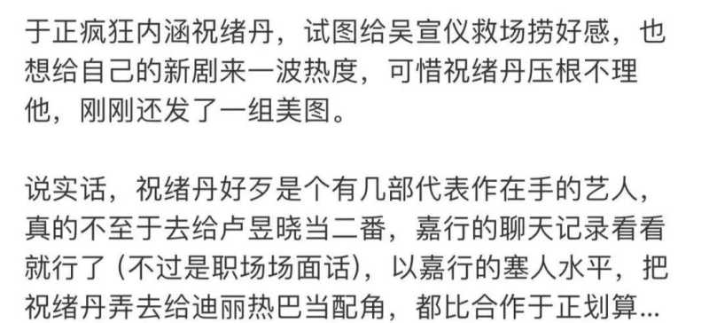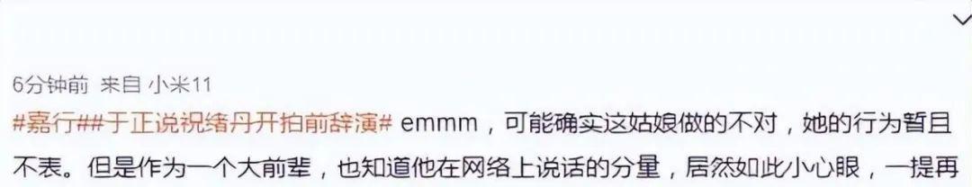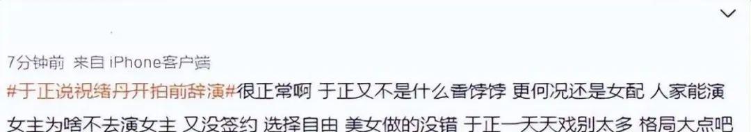 更有网友询问角色更换原因时,于正却以一种“阴阳怪气”的方式回应,称祝绪丹“突然”有了主角机会,而自己又不能“挡人前途”。于正的这一举动迅速引发了祝绪丹辞演换角的热议。