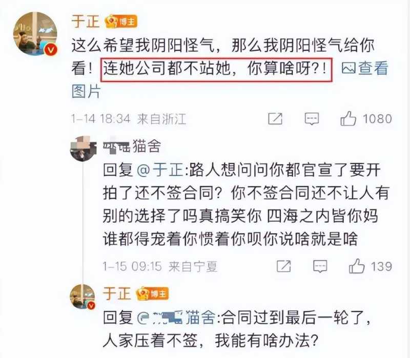 有网友留言给于正,表示演员和导演之间应该是双向选择,双方又没有签署合同,于正在这里斤斤计较、阴阳怪气,只会凸显出他口舌太利了!看到这条留言后,于正感到羞愧和愤怒。