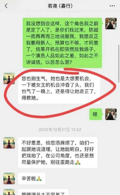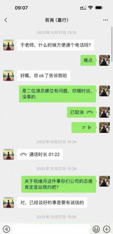 他立刻公布了自己和经纪公司的聊天截图,试图证明自己无辜。在聊天记录中,他一边质问对方,一边说祝绪丹品性有问题。工作人员一直在为祝绪丹道歉,试图让于正息怒。