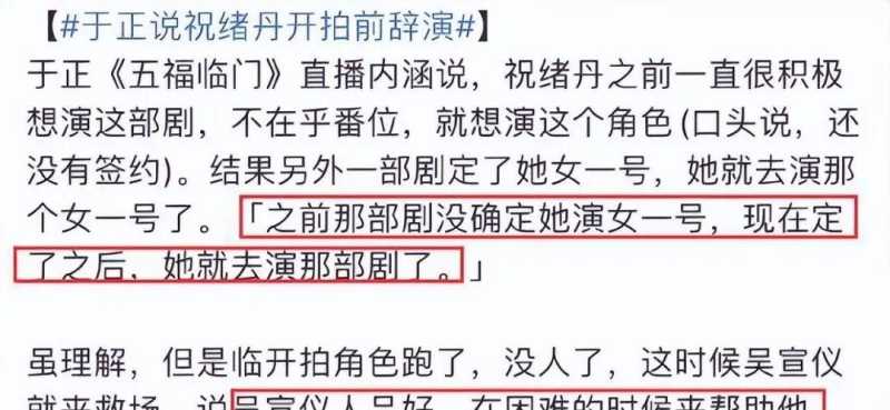 因为他们发现,祝绪丹辞演是在于正新剧宣传之前就已经发生了。12月26日,于正就已经知道祝绪丹辞演了。而于正的新剧宣传则是在祝绪丹辞演后的第二天才发布的。