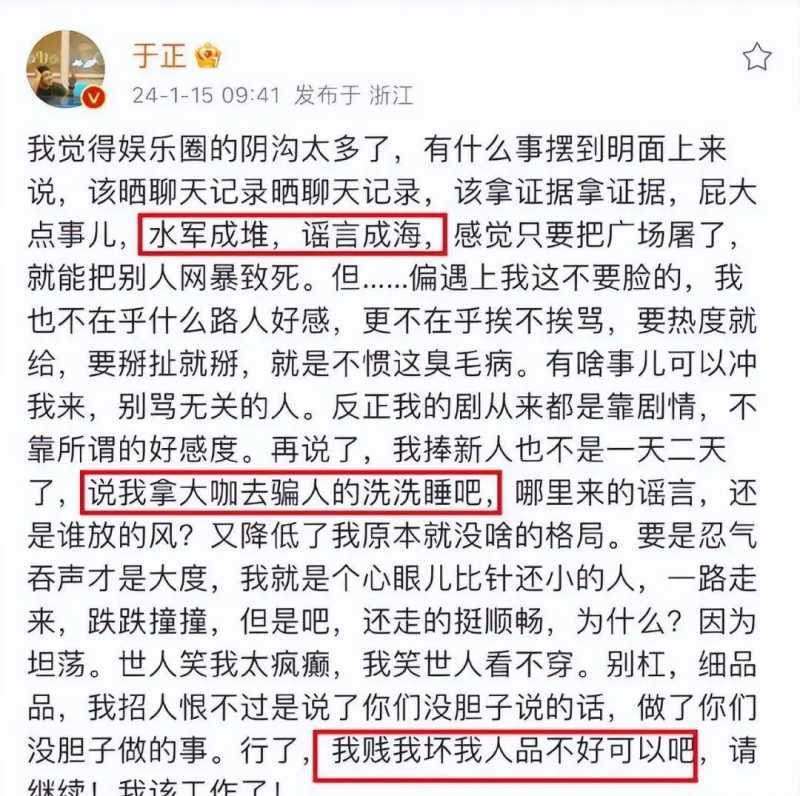 然而,于正在事件发酵后的态度却引发了更多质疑。他在长文中指责网上言论为水军和谣言,称这一事件为“屁大点事儿”。