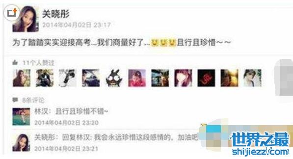 到了2014年4月份,关晓彤的恋情发生转变,她自己发文说:“为了踏踏实实迎接高考,我们商量好了,且行且珍惜!”男友林汉也回复:“且行且珍惜不错。”但是了,两个人的恋情并没有走到最后,高中时期两个人分手。据传两人曾打算高考后复合,但最终还是不了了之。