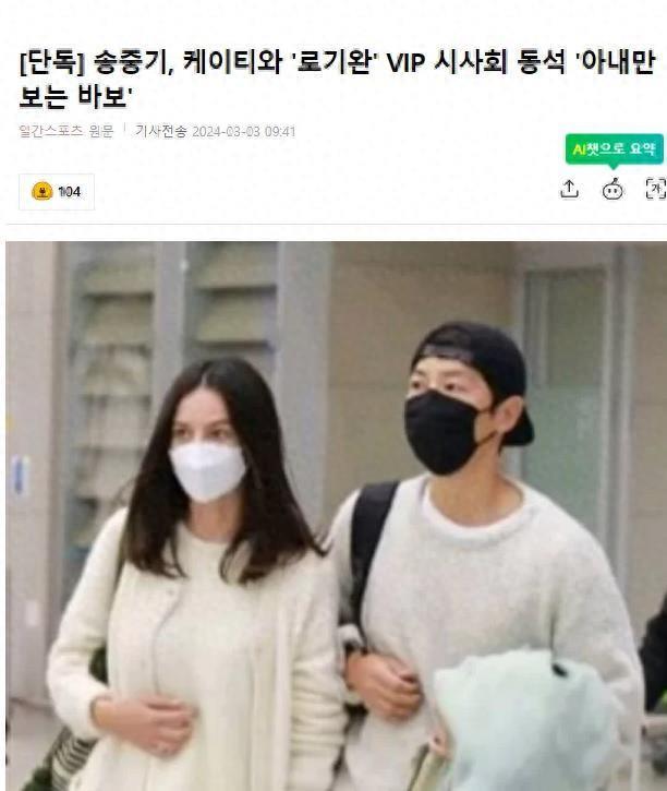 3月3日,有韩国媒体报道,韩国知名演员宋仲基和妻子凯蒂·路易斯·桑德斯最近出席了在首尔龙山区CGV龙山购物中心举办的VIP发布会,为他主演的Netflix电影《路基完》上映做准备。