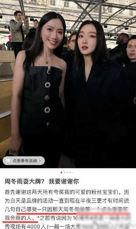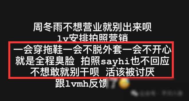 然而,这场时装盛宴的表面光鲜亮丽之下,却隐藏着一段充满争议的故事。富婆姐在社交媒体上点名批评了周冬雨的不良行为,指责她在与VIP合影时的态度恶劣,甚至不脱外套、臭脸不开心、不回应打招呼。这番言论立刻引来了周冬雨粉丝的反击,纷纷质疑富婆姐的说法。