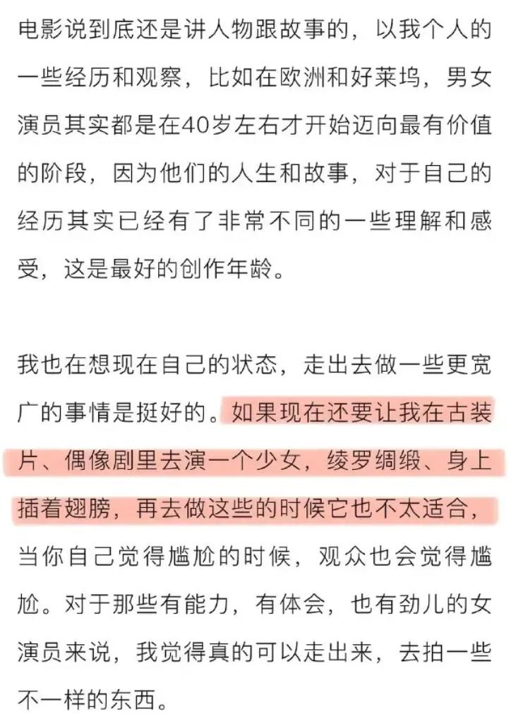 范冰冰被问到怎么看待不同年龄层女性演员对自己的定位时,她以自身的观察来说,在好莱坞及欧洲,演员都是在40岁左右,开始迈向最有价值的阶段,因为对于人生经历有了一些理解和感受,是最好的创作年龄。 范冰冰接着提到,「如果现在还要让我在古装片、偶像剧里去演一个少女,绫罗绸绬、身上插着翅膀,再去做这些也不太适合,当你自己觉得尴尬的时候,观众也会觉得尴尬」。 这段内容也被网友解读,她暗指章子怡在《上阳赋》插着翅膀扮少女的造型,当时章子怡就被网友嫌老。