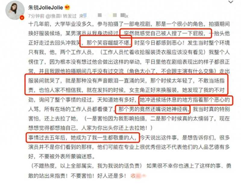 朱锐在文中披露,自己在青涩的演艺生涯初期,曾遭受某男演员的猥亵。那时的她,尚不懂得如何面对与反抗,只能默默承受这份屈辱。而那名男演员,在公众面前展现出的形象与私下行为大相径庭,让人不禁感叹娱乐圈的复杂与多变。
