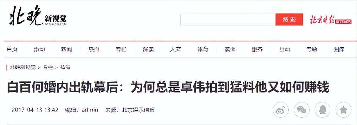 信息来源:北京娱乐信报,2017年04月13日,《白百何婚内出轨幕后:为何总是卓伟拍到猛料他又如何赚钱》
